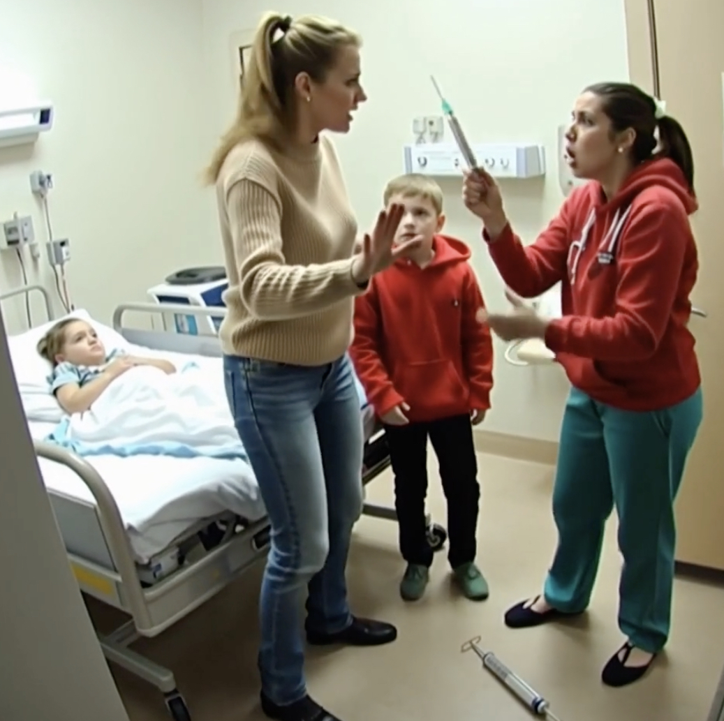 Jenna’s eyes widened in shock, the syringe still poised mid-air. “You…you weren’t supposed to hear that,” she stammered, her façade of professionalism crumbling. “Put it…
