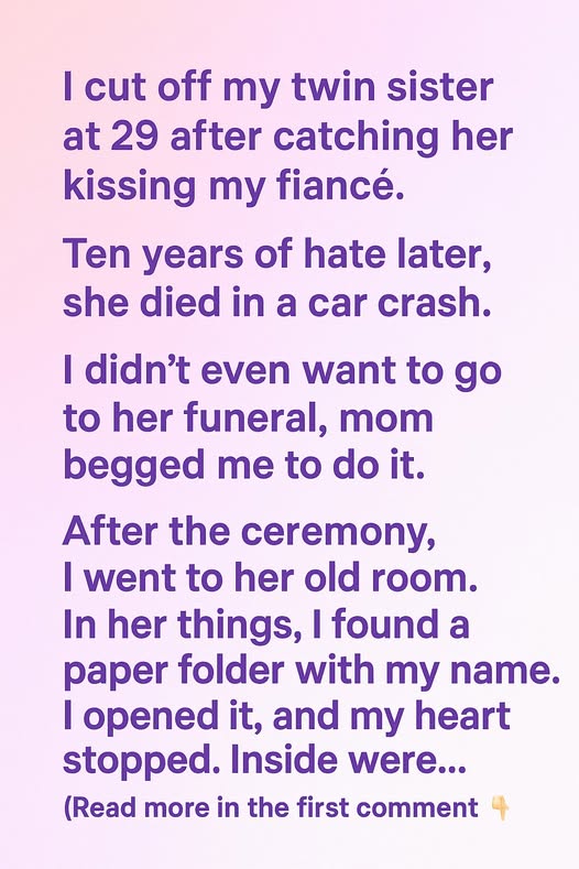 I cut off my twin sister at 29 after catching her kissing my fiancé. Ten years of silence followed — ten years of hurt, anger,…