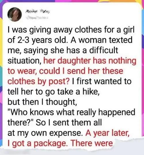 At first, I was hesitant. A part of me wondered if it was a scam or if she was just taking advantage of my kindness. My initial reaction was to tell her no, but then I paused and thought, “What if her story is true? What if this child genuinely needs these clothes?” With that thought, I decided to take a chance. I packed everything up and mailed it to her, covering the shipping cost myself, even though it wasn’t easy for me financially.