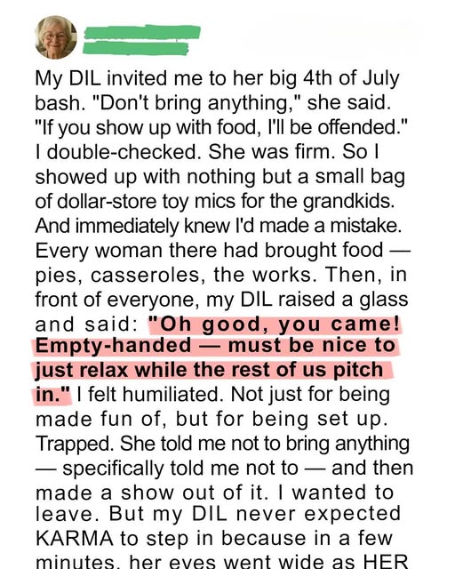 When my daughter-in-law, Karen, invited me to her big Fourth of July celebration, she made one thing very clear: “Don’t bring anything.” She even called me three times to repeat it, insisting she had everything covered. It felt strange because I was raised never to show up empty-handed, but I decided to respect her wishes. The only thing I brought was a small bag of toys for my grandkids, including little microphones with American flags on them. I thought they’d have fun playing with them during the fireworks.