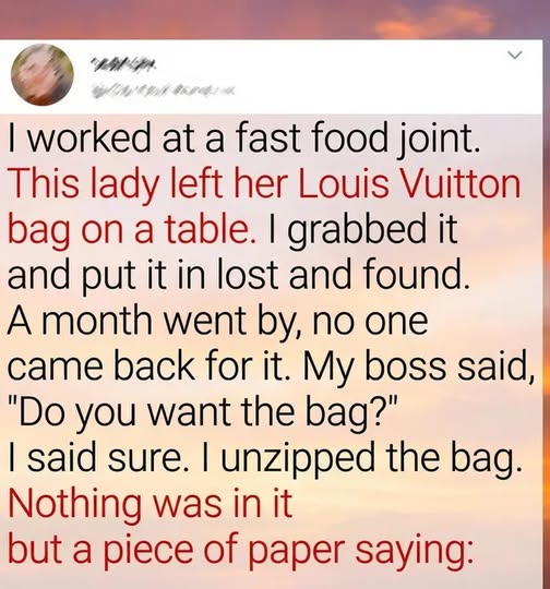 I worked at a fast food joint. This lady left her Louis Vuitton bag on a table. I grabbed it and put it in lost and found, assuming she would rush back any minute. Luxury bags don’t simply get forgotten, I told myself. But hours passed, then days, and finally an entire month with no sign of her. Our little lost-and-found shelf gathered the usual umbrellas and water bottles, but that bag remained untouched, almost out of place among the everyday clutter. One afternoon, while checking inventory, my boss glanced at it and casually asked, “Do you want the bag? It’s been long enough.” I hesitated, unsure if taking something so valuable was right, but he reminded me that we had followed all the proper procedures. So I finally agreed and unzipped it, expecting a wallet, keys—something. Instead, it was completely empty except for a single folded piece of paper.
