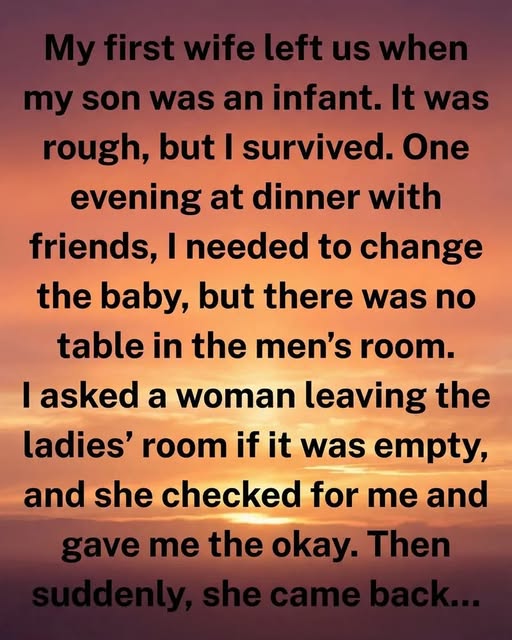 My first wife left us when my son was an infant. It was rough, but I survived. One evening at dinner with friends, I needed to change the baby, but there was no table in the men’s room. I asked a woman leaving the ladies’ room if it was empty, and she checked for me and gave me the okay. Then suddenly, she came back… She tapped gently on the door and asked, “Do you need help?” Her voice sounded kind, not intrusive, and when I stepped out, she smiled in a way that made the chaos of single fatherhood feel a little less heavy. I thanked her and told her I had things under control, but she lingered for a moment, just long enough to say, “You’re doing great. Don’t let anyone tell you otherwise.” I nodded, unsure why her comment felt so comforting, but somehow it did. That night, as I drove home with my son asleep in the back seat, I kept thinking about how a stranger’s small gesture had softened a day that had felt endlessly hard.
