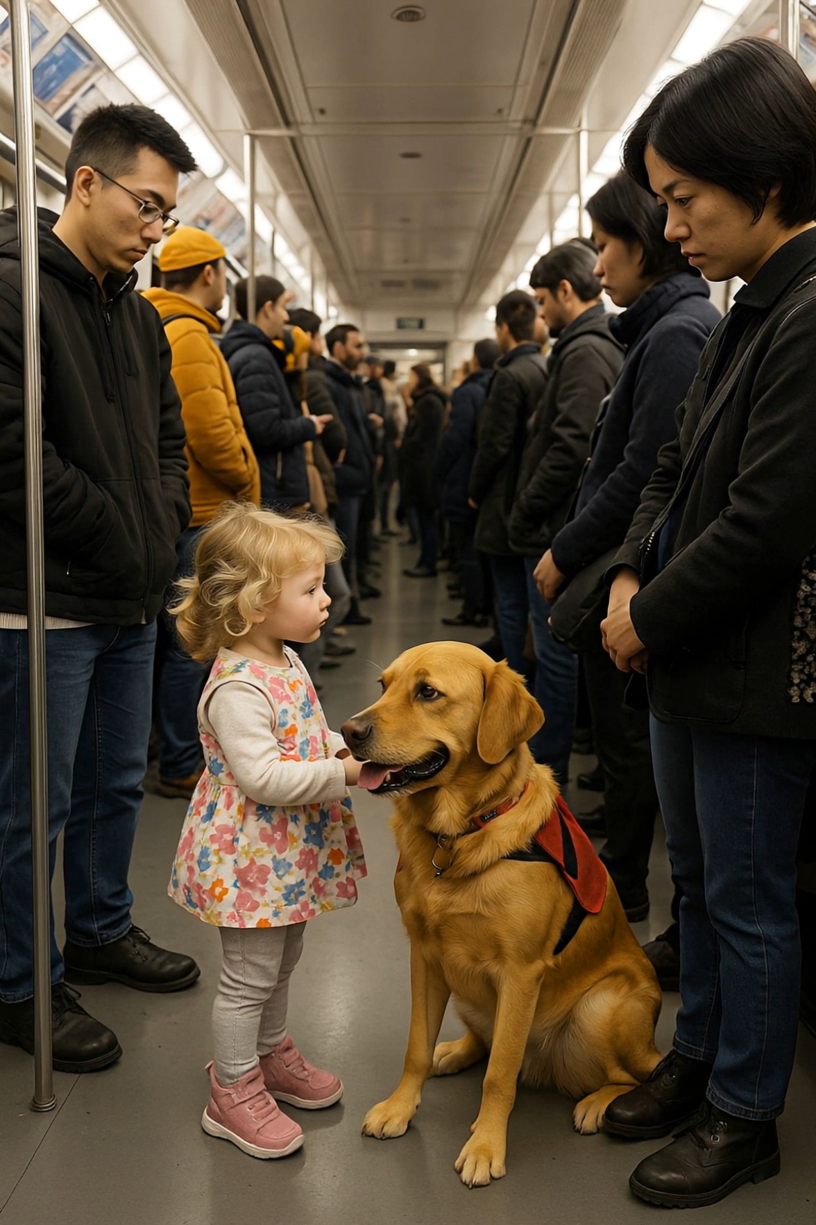 They got off at the next station. The man took the girl’s hand and led her back, holding the dog’s leash. When the doors opened on the platform, a breathless woman rushed in — eyes red, hands trembling, barely able to breathe from panic.