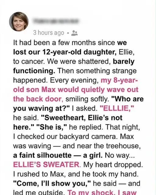 I first noticed Max waving at the backyard at sunset, smiling softly as if greeting someone familiar. When I asked, he simply said, “Ellie.” He…