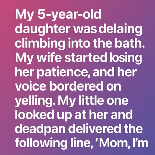 My 5-year-old daughter was delaying climbing into the bath. My wife started losing her patience, and her voice bordered on yelling. My little one looked up at her and deadpan delivered the following line, “Mom, I’m just trying to enjoy my last few minutes of freedom.” The room went silent, and for a moment, even the tension paused. My wife’s stern expression melted into a reluctant smile, and I couldn’t help but laugh quietly behind my hand. It was one of those moments when a child’s innocent honesty breaks through the frustration of parenting and reminds you that even tiny humans experience their own big emotions. What could have escalated into an argument instead became a gentle reminder that patience and humor often walk hand in hand.