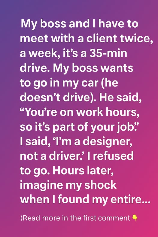 My boss and I were required to meet a client twice a week, a 35-minute drive away. Since he didn’t drive, he assumed I’d take him in my car, insisting it was “part of my job” because it was during work hours. I calmly explained, “I’m a designer, not a driver, and my car isn’t part of the company fleet.” He seemed annoyed when I refused, but I stood my ground. I didn’t think much of it—until later that day.