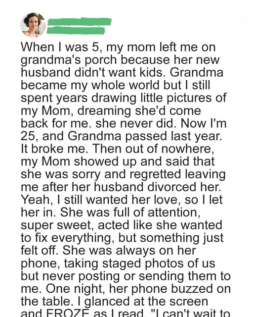 Twenty years later, after Grandma passed away, grief filled my quiet apartment. Then came a knock at the door. My mother stood there, older and polished, asking for a second chance. She said she regretted leaving me and wanted to rebuild what we lost. My heart—still holding the little girl who had waited for her—opened just enough to let her in. We shared lunches, stories, and tears, and for a moment, I dared to believe we were healing.