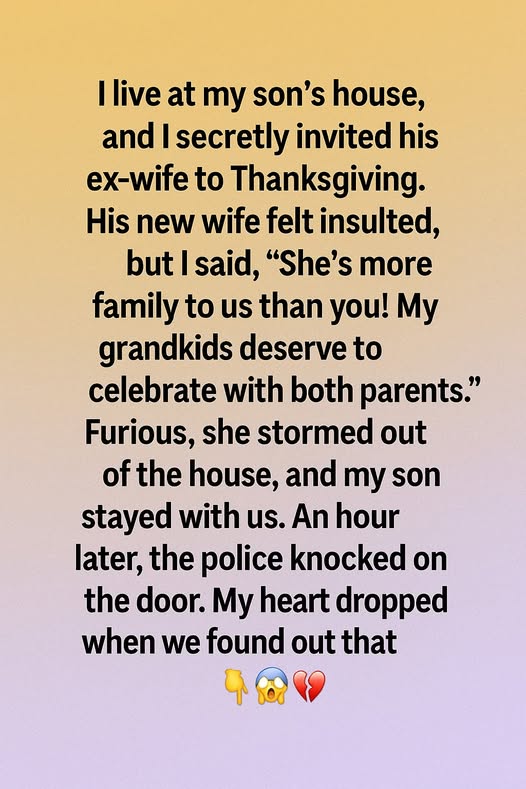 I live at my son’s house, and I secretly invited his ex-wife to Thanksgiving. His new wife felt insulted, but I said, “She’s more family…