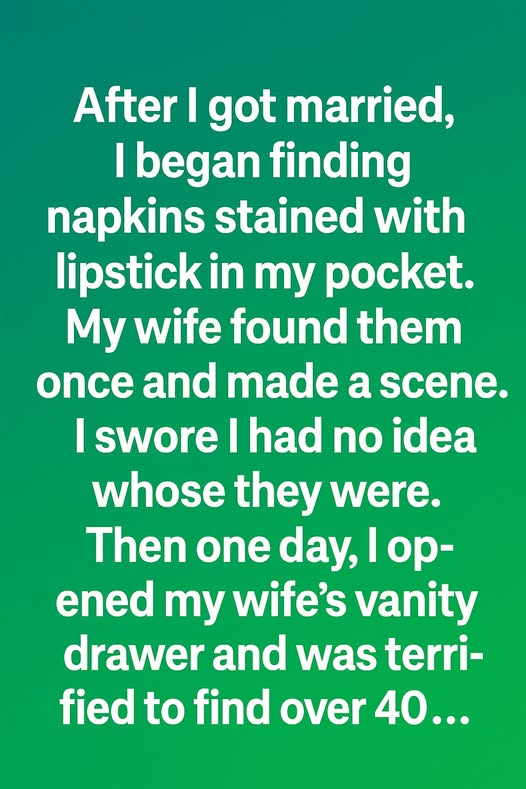 After I got married, I began finding napkins stained with lipstick in my pocket. My wife found them once and made a scene. I swore I had no idea whose they were. Then one day, I opened my wife’s vanity drawer and was terrified to find over 40… identical lipsticks.